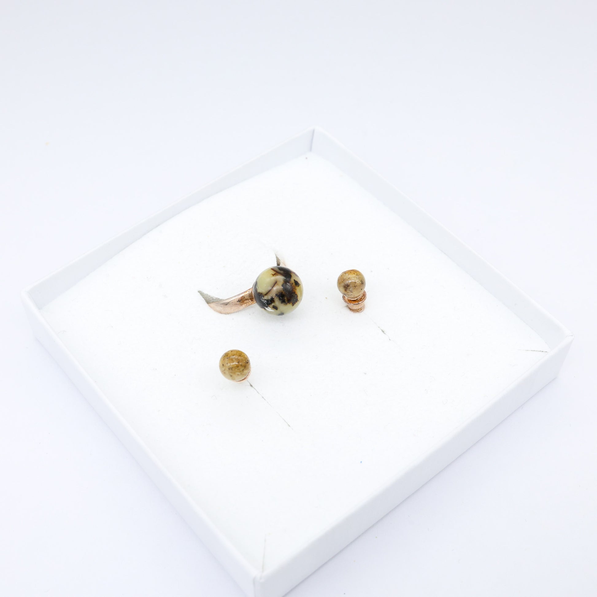 ✨ Design Exclusivo: composto por um anel ajustável em prata e um par de brincos em formato esfera, com tonalidade única que mistura dourado, bege e detalhes naturais característicos do âmbar.