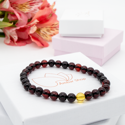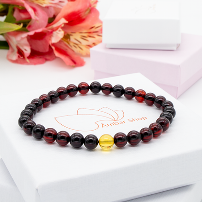 The polished ROYAL BRUTO cherry Baltic amber bracelet has the following characteristics: