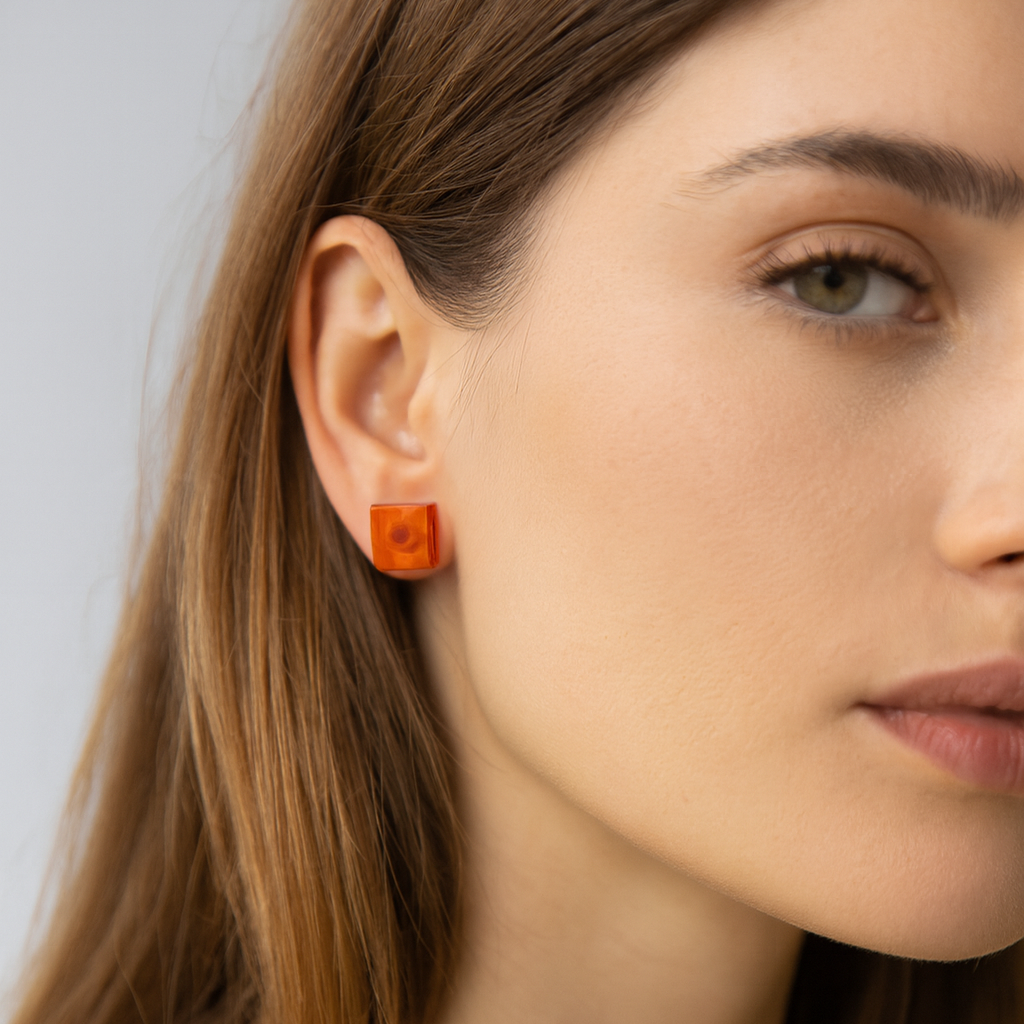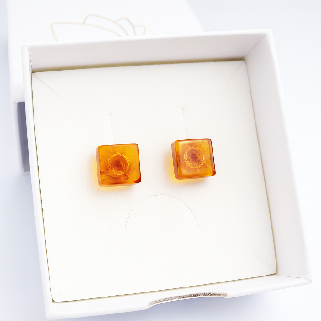 Moderno, leve e cheio de brilho natural. Este brinco é confeccionado com âmbar báltico autêntico lapidado em formato quadrado, com interior translúcido em tom mel que revela detalhes orgânicos únicos — pequenos vestígios naturais que tornam cada peça exclusiva.