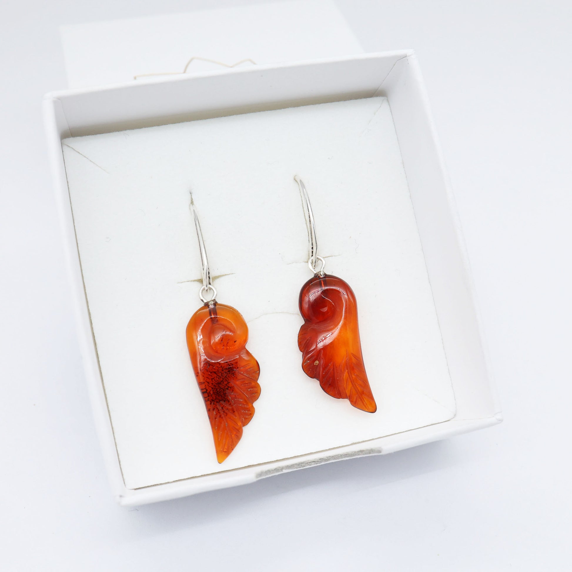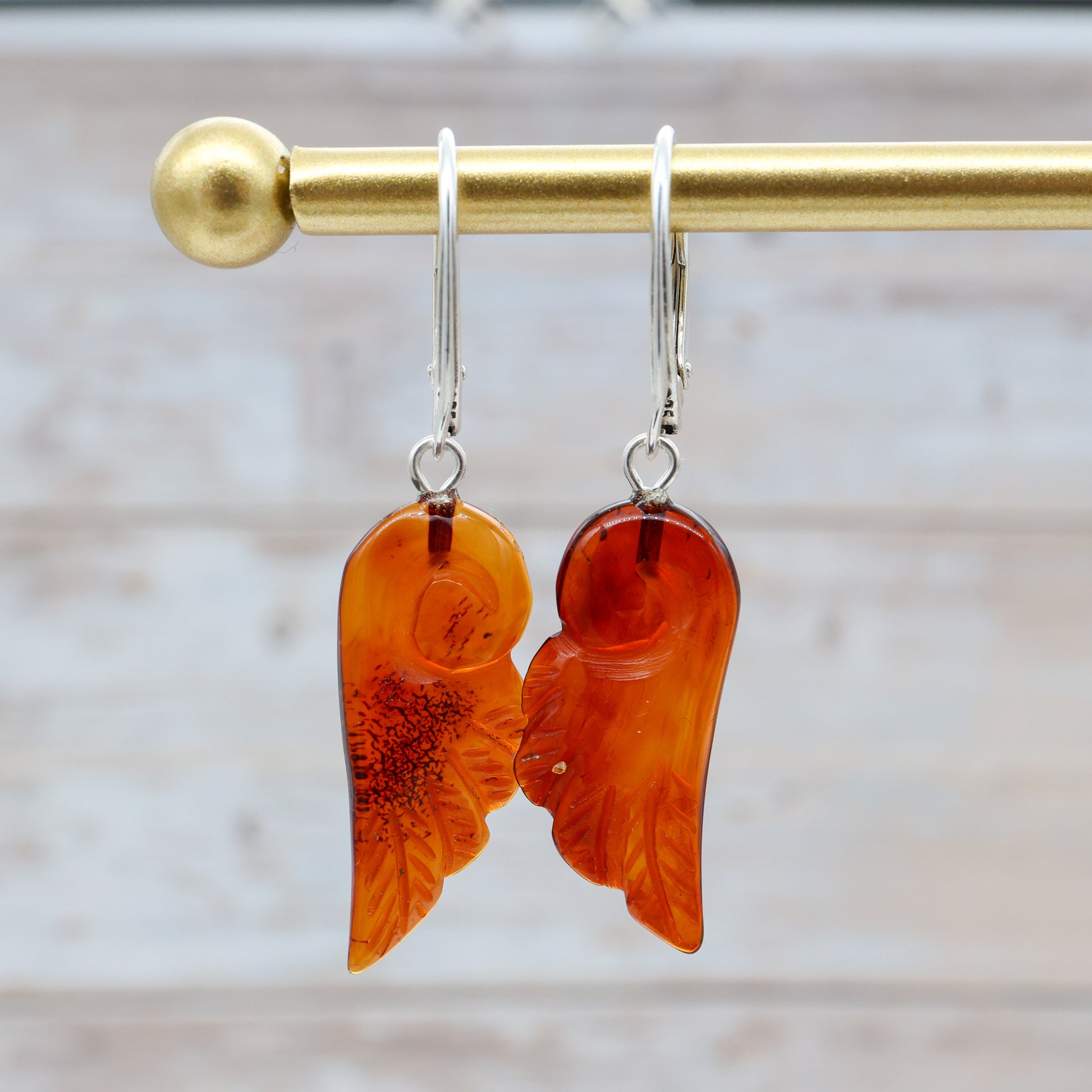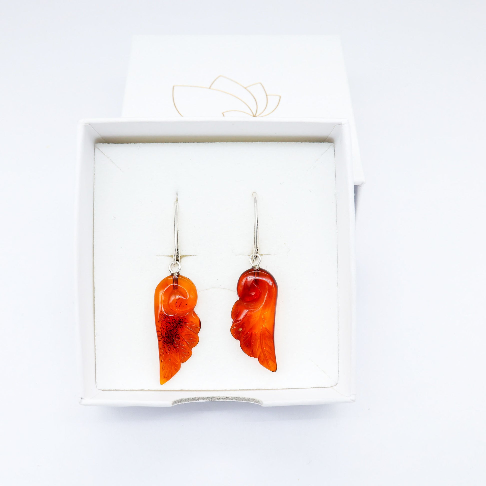 Elegante e cheio de significado, este brinco em formato de asa é esculpido artesanalmente em âmbar báltico natural, exibindo variações orgânicas internas que tornam cada par único. A peça possui acabamento translúcido em tom mel-alaranjado, refletindo a luz com profundidade e brilho natural.