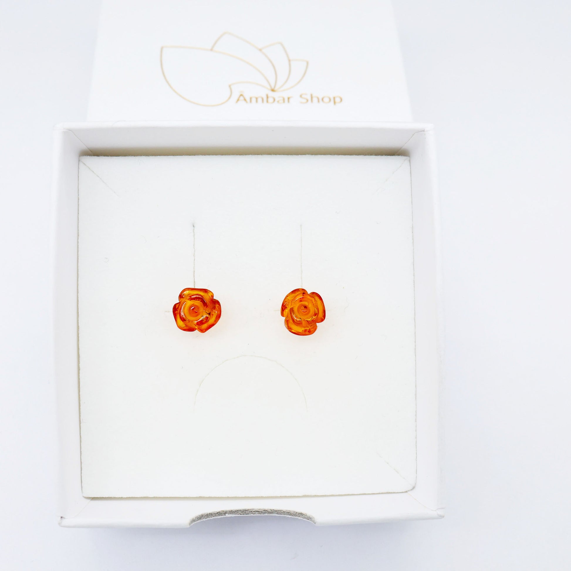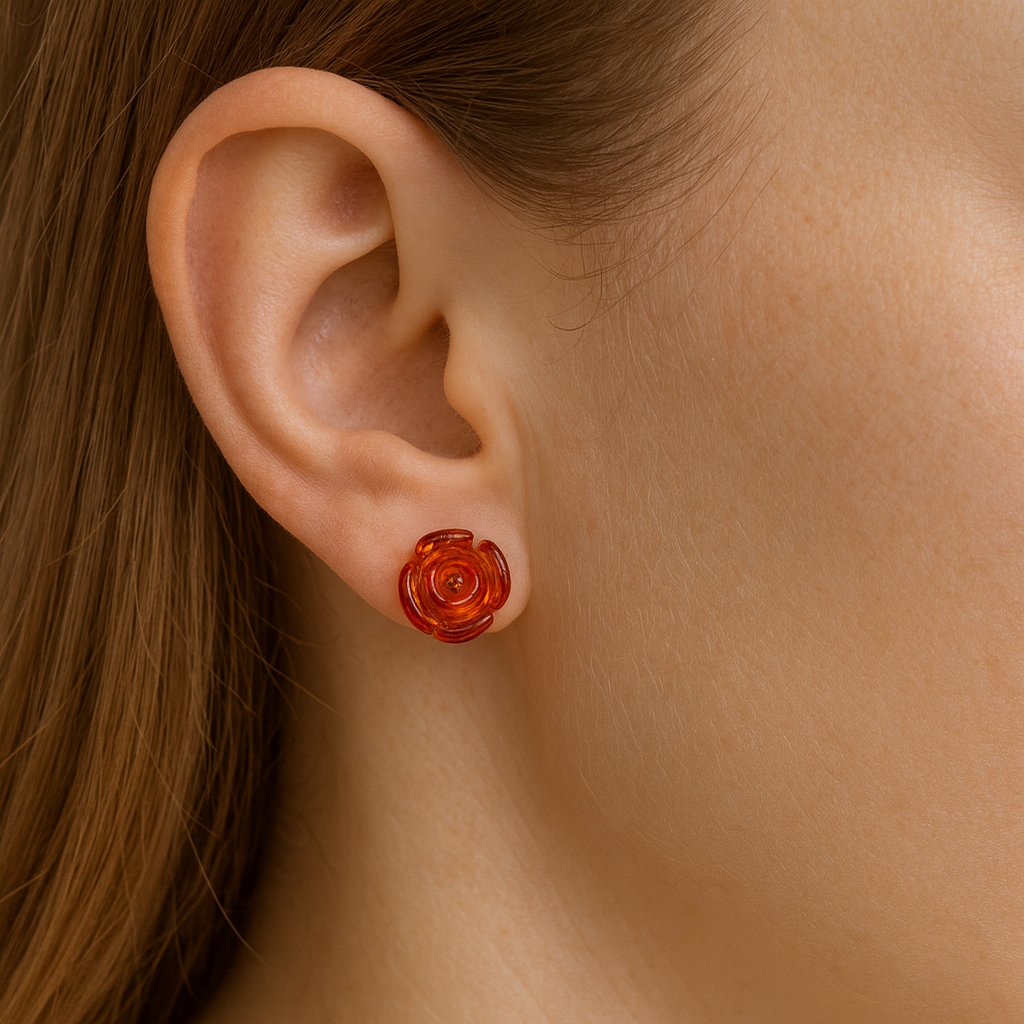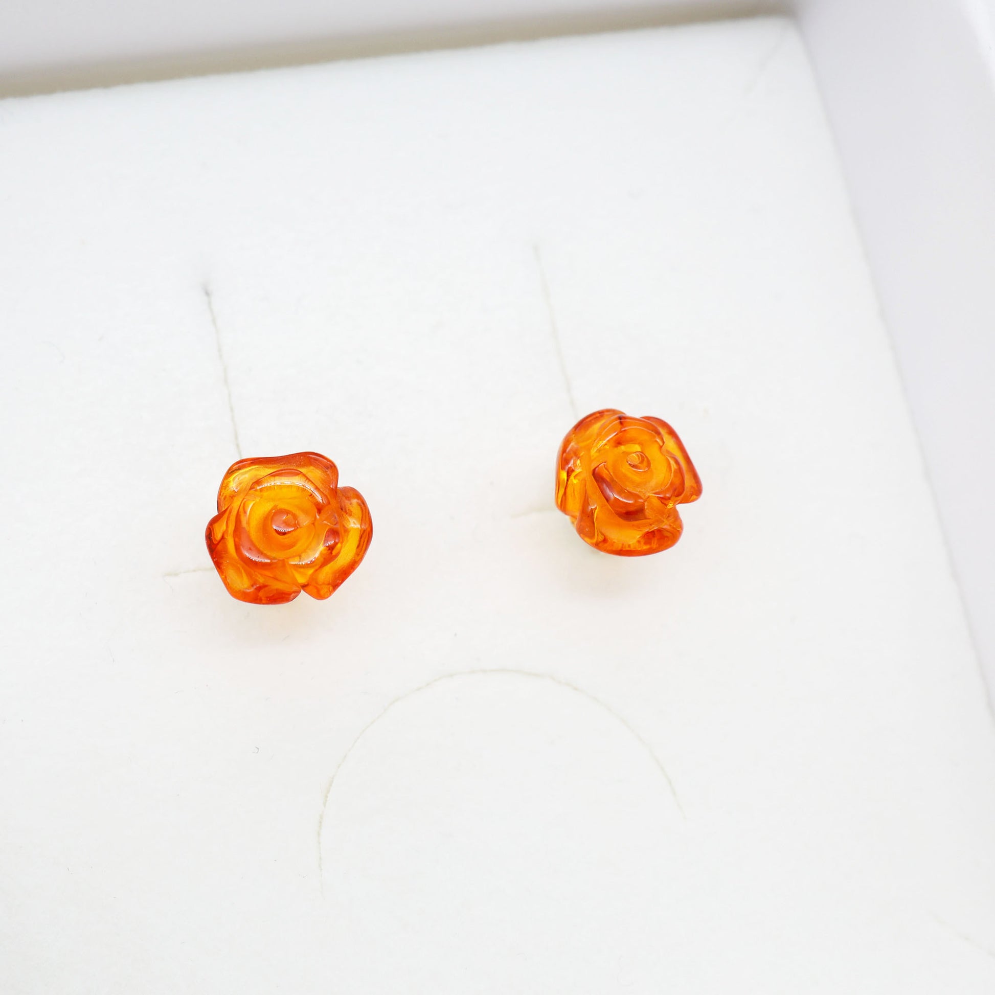 Encante-se com a delicadeza deste brinco feito em âmbar báltico natural, esculpido manualmente no formato de pequena rosa. Cada peça é única, com tons de mel dourado que capturam a luz de forma suave e elegante.