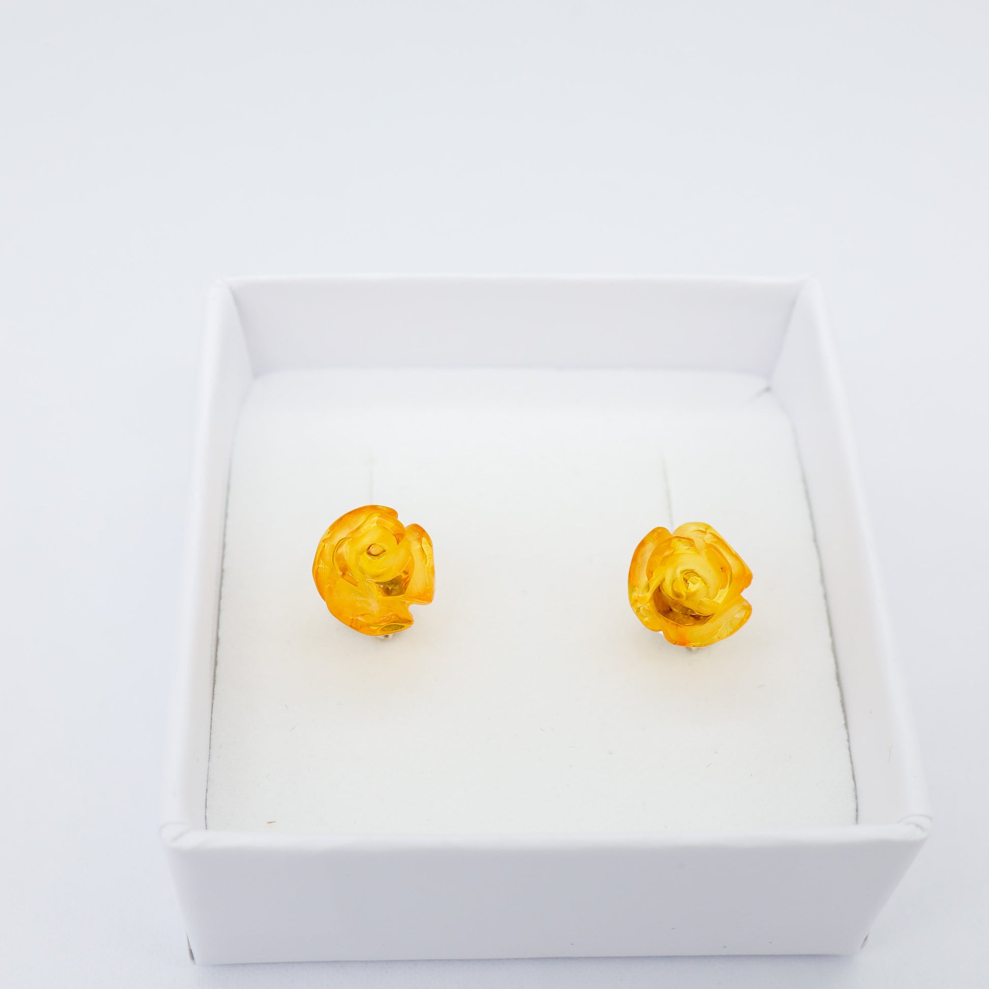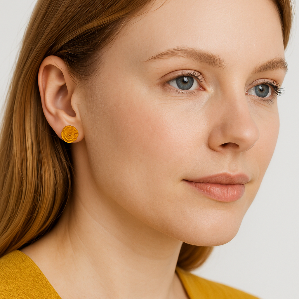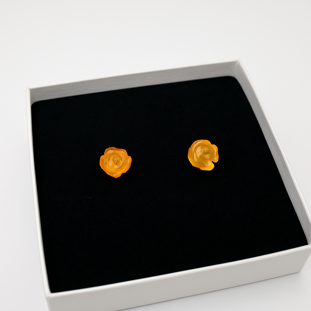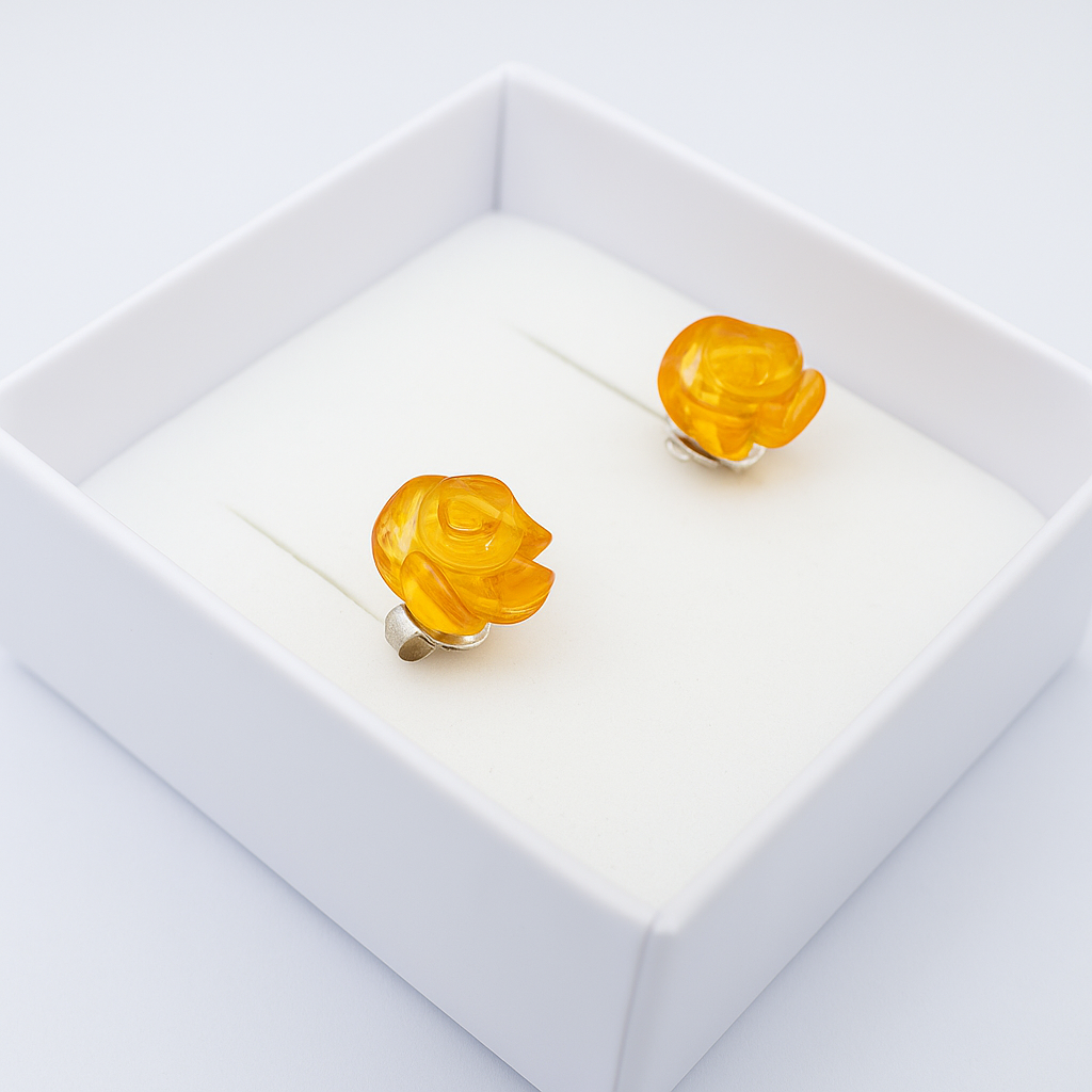 Encante-se com a delicadeza deste brinco feito em âmbar báltico natural, esculpido manualmente no formato de pequena rosa. Cada peça é única, com tons de mel dourado que capturam a luz de forma suave e elegante.