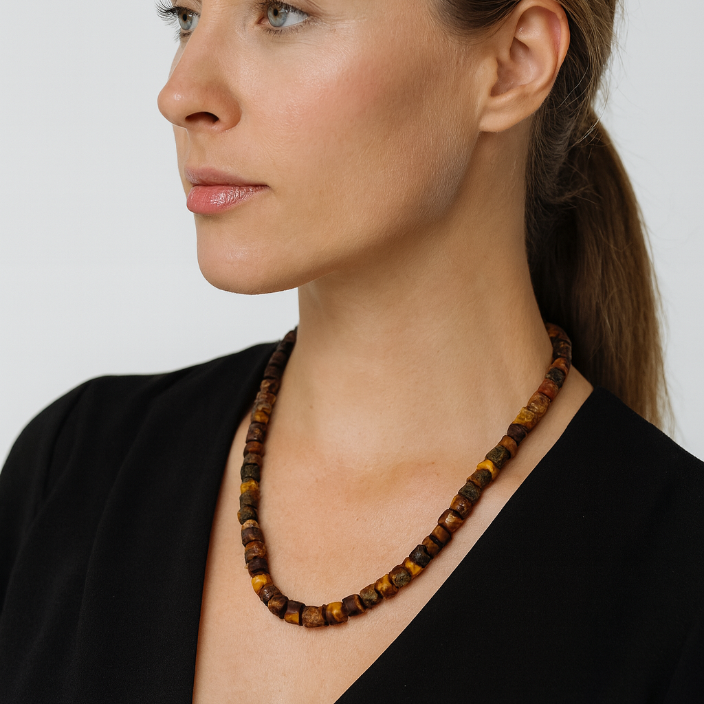 O Colar Âmbar Força da Natureza é uma peça poderosa e autêntica, criada com âmbar báltico 100% natural em tom verde escuro bruto, preservando toda a textura original da resina fóssil com mais de 40 milhões de anos.