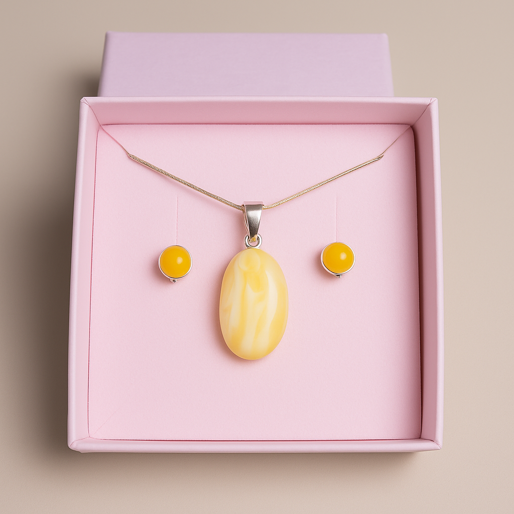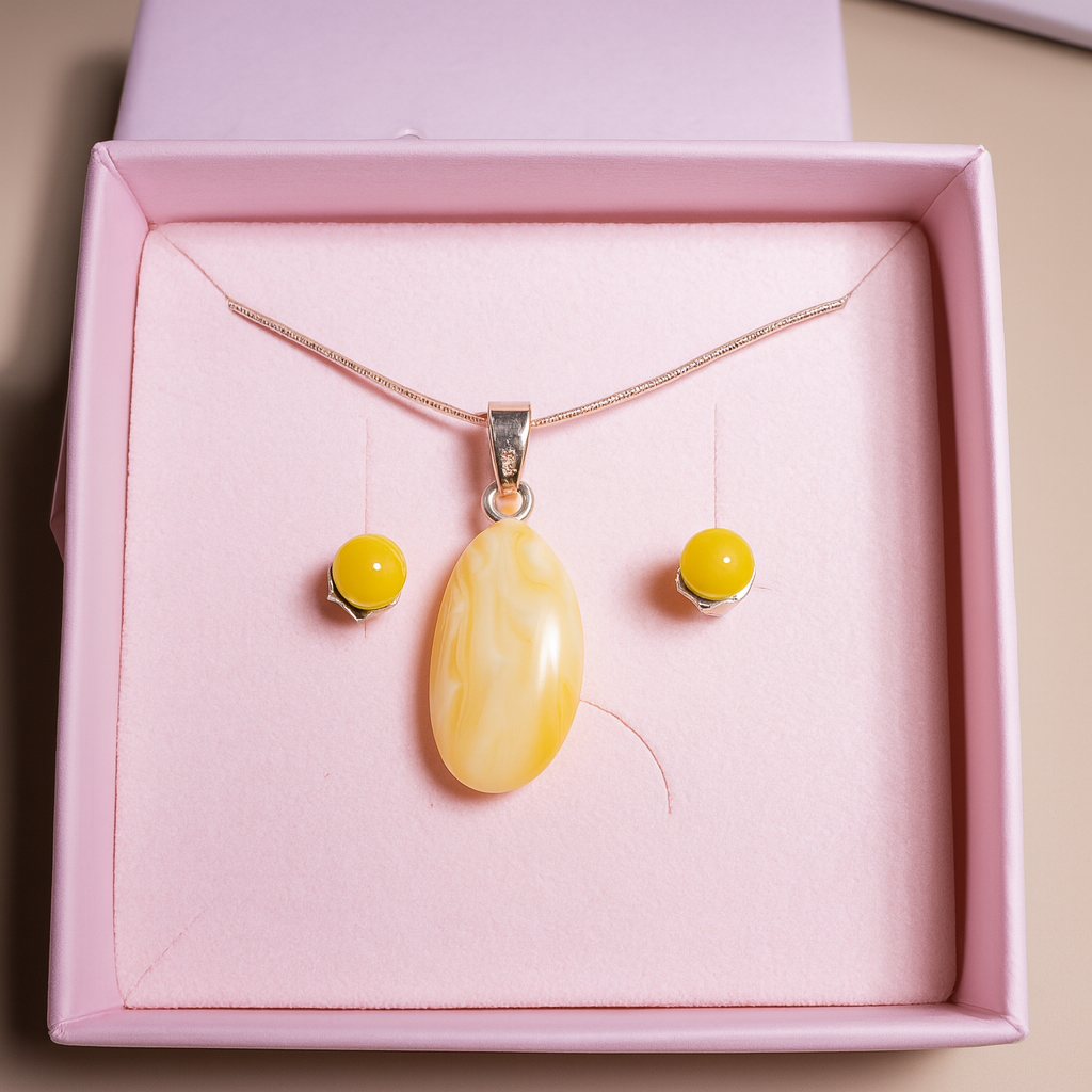 O Conjunto Luz do Sol é perfeito para quem deseja transmitir alegria e elegância ao mesmo tempo. Produzido com Âmbar Báltico genuíno na tonalidade butterscotch (leite), o conjunto inclui: