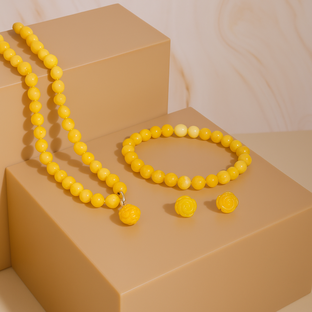 A cor amarela leitosa do âmbar transmite suavidade e calor, tornando este conjunto perfeito para quem busca um estilo elegante e iluminado.