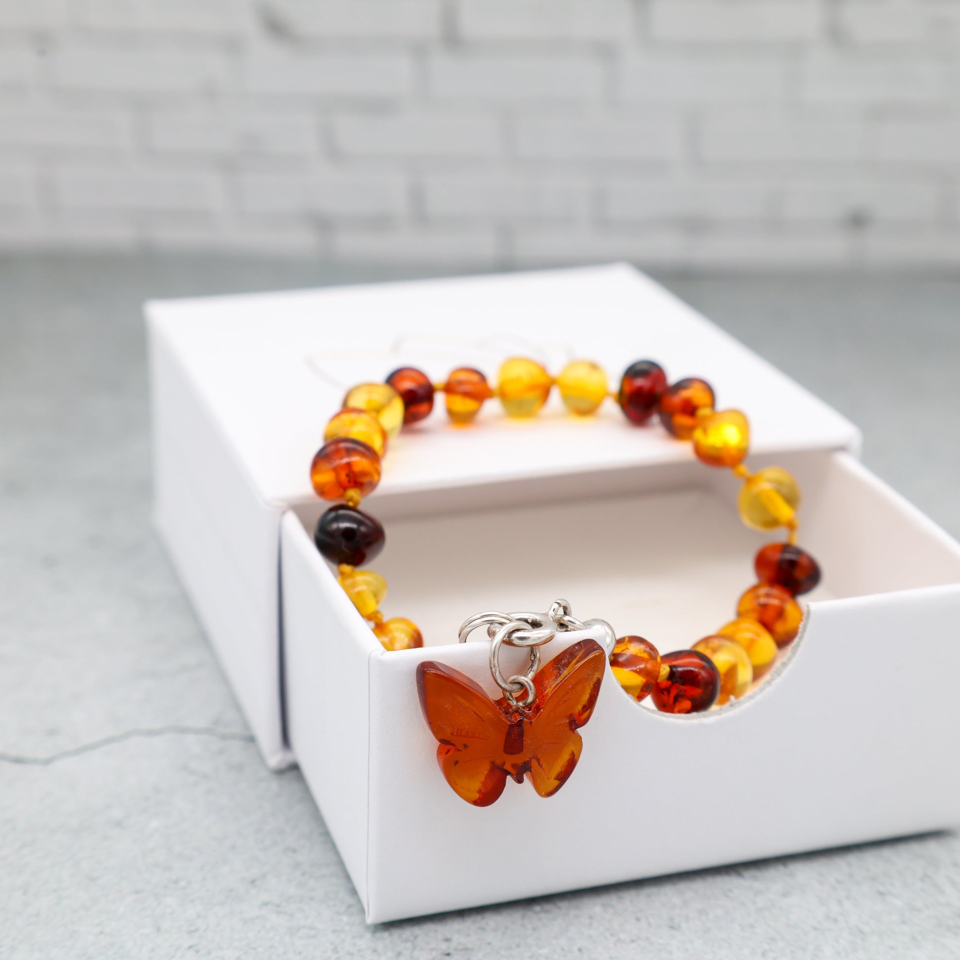 Pulseira de Âmbar Báltico Misto 18 cm com pingente BORBOLETA