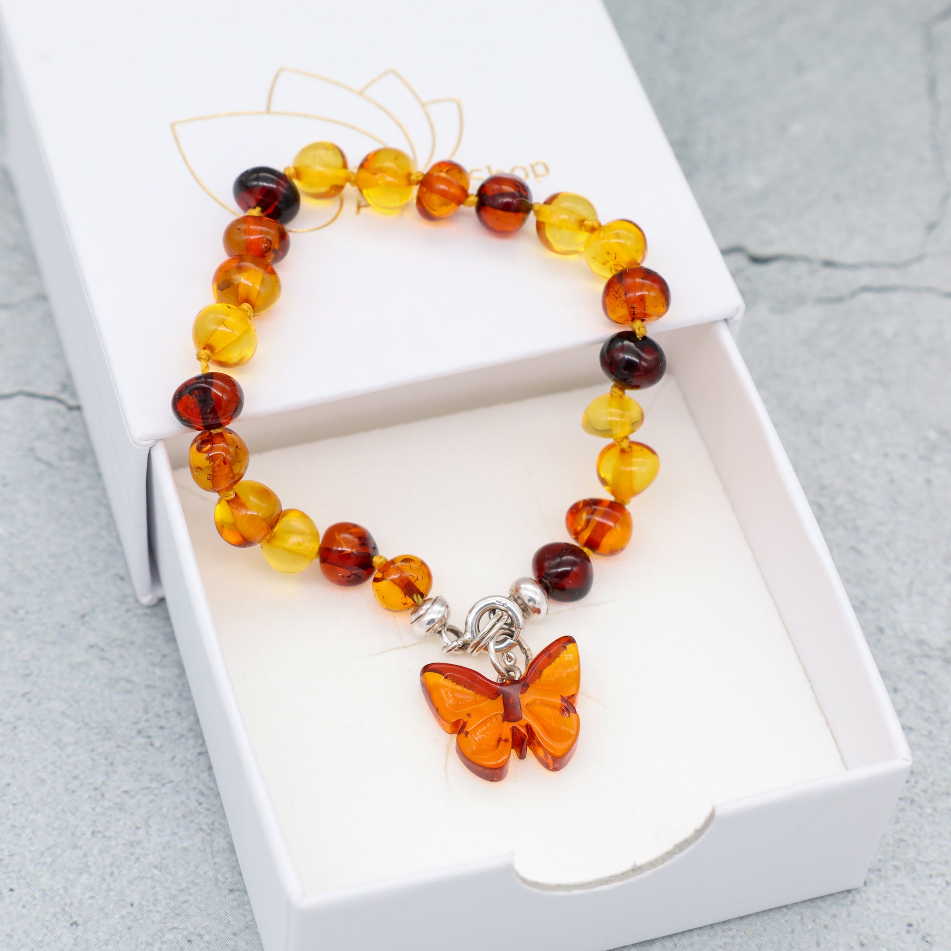 A pulseira de âmbar báltico misto com pingente BORBOLETA apresenta as seguintes características: